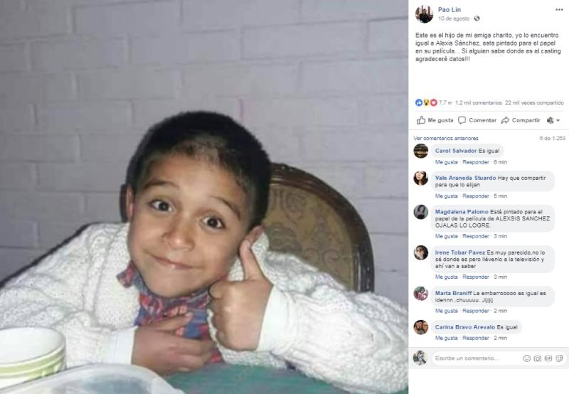 “Este es el hijo de mi amiga charito, yo lo encuentro igual a Alexis Sánchez, está pintado para el papel en su película… Si alguien sabe dónde es el casting agradeceré datos!!!” , dice la publicación.