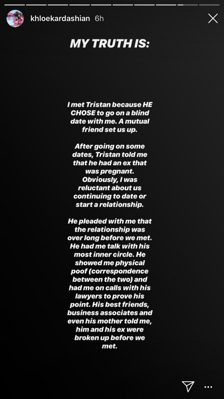 Esta es su versión: “MI VERDAD ES: Conocí a Tristan porque ÉL decidió venir a una cita a ciegas conmigo. Un amigo común lo preparó todo. Después de algunas citas, Tristan me dijo que tenía una ex y que estaba embarazada. Obviamente tuve muchas dudas sobre la continuidad de nuestra relación. Me prometió que su relación había terminado mucho antes de habernos conocido. Me hizo hablar con su círculo más cercano. Me enseñó pruebas -correspondencia privada entre ambos) y me puso en contacto con sus abogados para demostrarme su versión. Sus mejores amigos, sus socios y hasta su madre me dijeron que su ex y él ya habían roto cuando nos conocimos", partió explicando.
