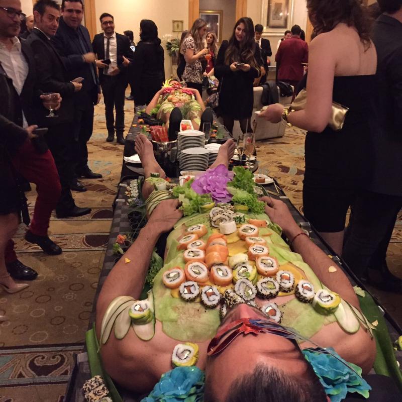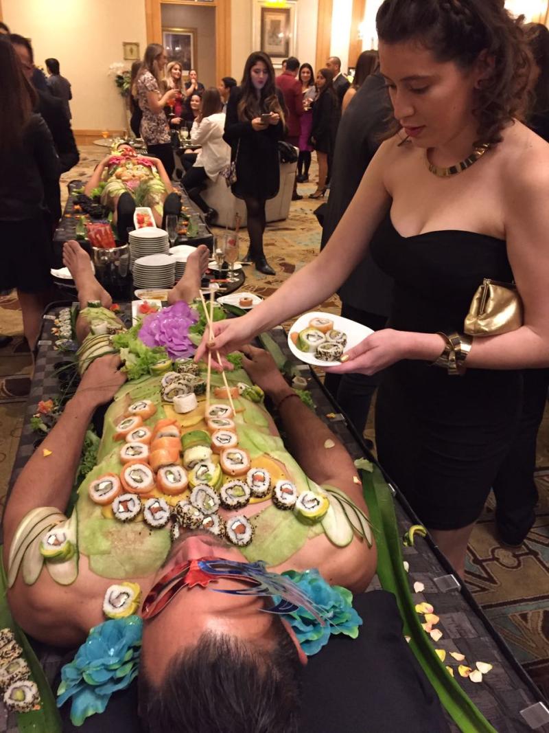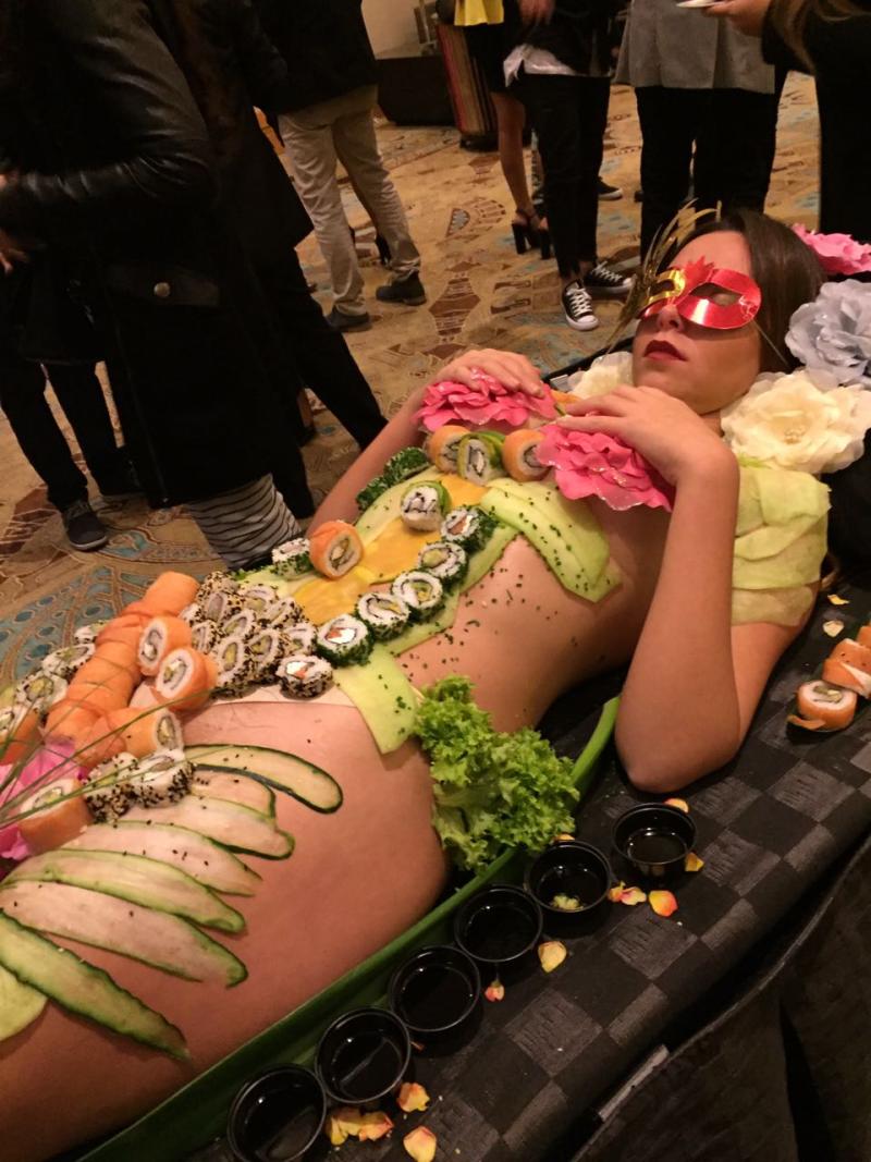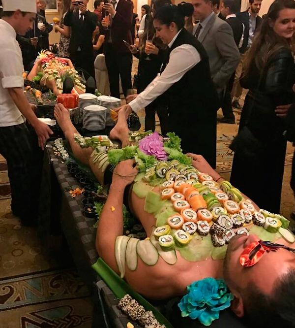 Modelos ligeros de ropa, acostados como si fuesen una mesa, exponían piezas de sushi, algo que se conoce como "body sushi". Las historias y fotos en Instagram no se hicieron esperar y las críticas tampoco.