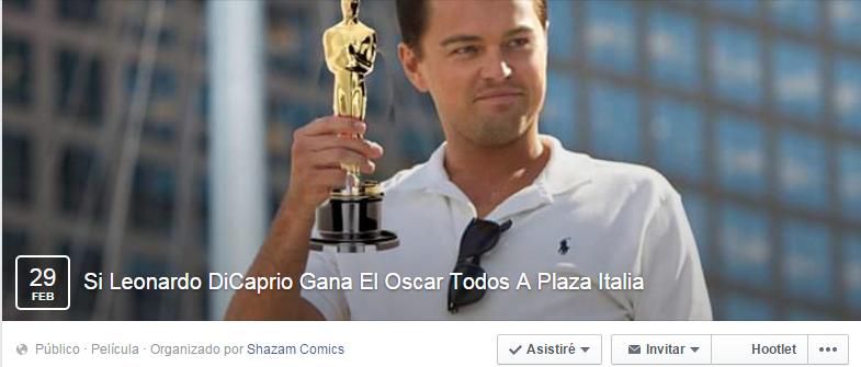 En Facebook corre un evento que invita a celebrar en Plaza Italia si Leonardo DiCaprio gana por primera vez en su vida un Oscar. Se trata de la quinta nominación del actor que esta vez va por el galardón gracias a su papel en “Revenant: El Renacido”.