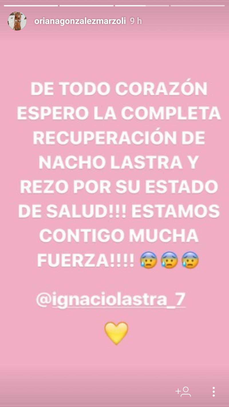 “De todo corazón espero la completa recuperación de Nacho Lastra y rezo por su estado de salud!!! Estamos contigo, mucha fuerza!”, escribió la modelo.