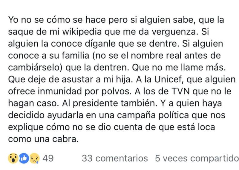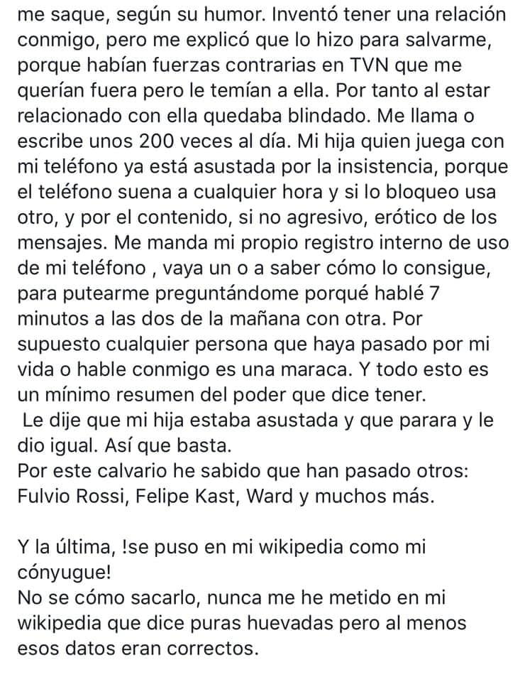 “Me escribió porque quería le firmara unos libros. Eso no prosperó y empezó a ponerse insistente pero ya con otro cariz. Nunca en mi vida la he visto”, detalla en su mensaje.