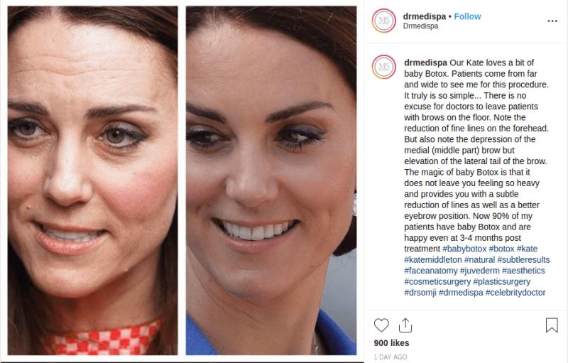 Resulta que un centro en Inglaterra publicó en redes sociales que Kate ama el baby bótox, mostrando una foto de antes y después que se esparció por la web.