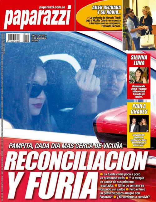 “Pampita” y Benjamín fueron sorprendidos juntos, en el auto. Ella lucía anteojos negros y él cuando se percató de la presencia de paparazzis recurrió a emular un común gesto de enojo y desprecio. Esta imagen, portada de la revista “Paparazzi” pertenece al fin de semana pasado.