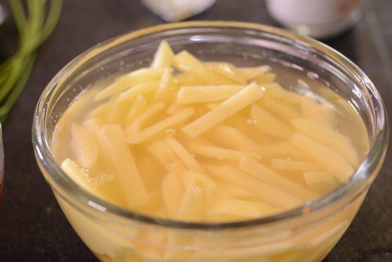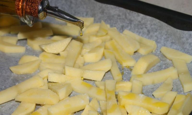 Estas contiene menos calorías y son fácil de hacer, quedan igual de crujientes y muy ricas. Primero que todo, debemos pelar y trozar las papas en bastones del tamaño que desees, dejándolas en un bol con agua reposando.