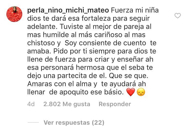 "Fuerza mi niña, Diós te dará esa fortaleza para seguir adelante. Tuviste al mejor de pareja, al más humilde, al más cariñoso, al más chistoso", escribió la gitana. Además, manifestó que "pido por ti siempre para Dios te llene de fuerza para criar y enseñar a esa persona hermosa que el Seba te dejó una partecita de él".