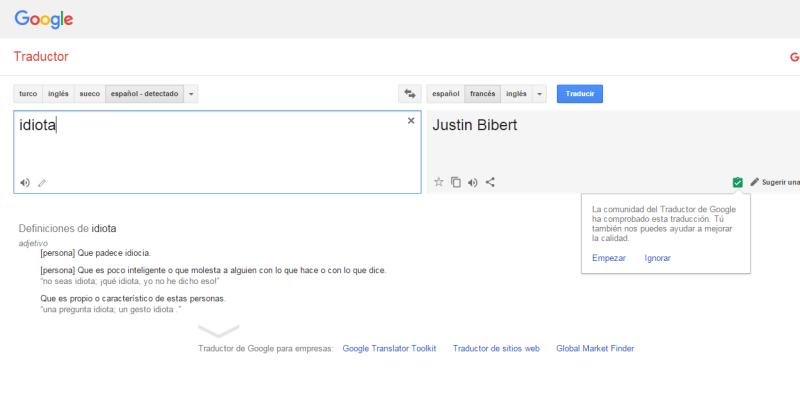 ¿Cómo ocurre esto? Bueno, si intentas traducir la palabra “idiota” al francés, la herramienta te arroja “Justin Bibert”.