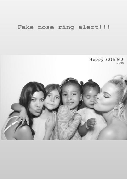 North aparece en varias fotografías del cumpleaños de su tatarabuela luciendo el cuestionado accesorio en su nariz.