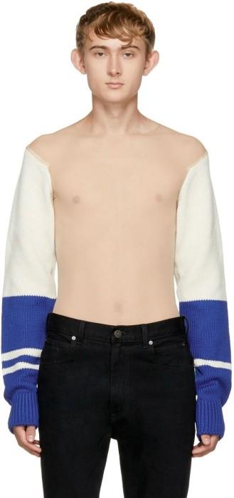 Un curioso diseño de Calvin Klein está dando qué hablar debido a las telas escogidas para darle vida. Se trata de un sweater de lana en mangas y textura traslúcida en el torso que deja a la vista el abdomen y pecho.