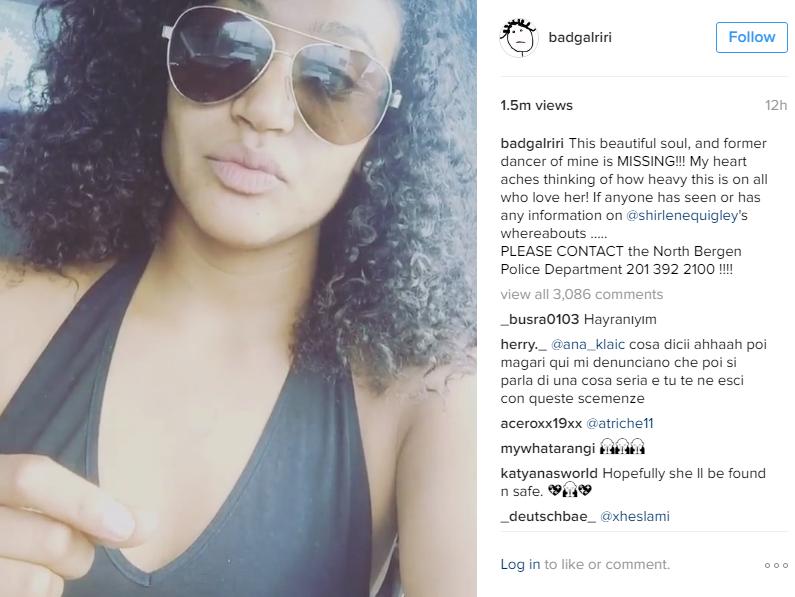 Rihanna ha utilizado su cuenta en instagram para informar sobre la desaparición de una de sus antiguas bailarinas, Shirline Quigley, la última vez que fue vista fue en la madrugada del domingo en el terminal de Nueva York subiéndose a un bus.