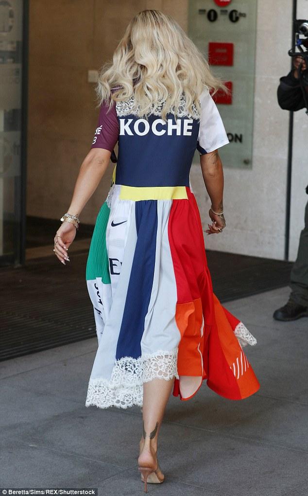 La cantante fue captada durante su llegada a los estudios radiales de la BBC este lunes en la mañana con el colorido diseño de Koché de casi dos millones de pesos chilenos.