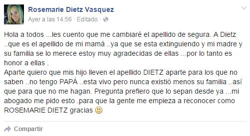 Las razones las entregó ella misma en su cuenta de Facebook, argumentando que el apellido de su madre se está perdiendo y por eso quiere usarlo, y además no ve a su papá hace muchos años, y nunca estuvo presente.