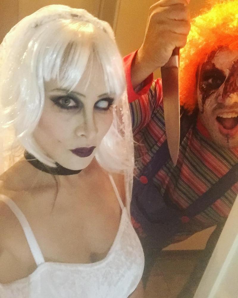 En su casa recibió a sus amistades, vestida como la novia de Chucky y Claudio con su peluca colorina representando al malévolo muñeco no se quedo atrás ¡Pura producción!