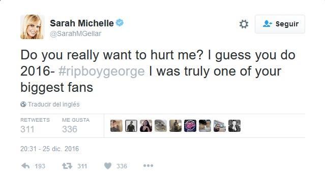 Diversas estrellas despidieron en redes sociales a George Michael, quien falleció durante la jornada del día 25 de diciembre a causa de un infarto en su domicilio. A los saludos y escritos se sumó el de Sarah Michelle Gellar, pero la actriz no tardó en ser advertida por usuarios en cosa de segundos. Su tuit fue dirigido a Boy George, por lo que tuvo que pedir disculpas.