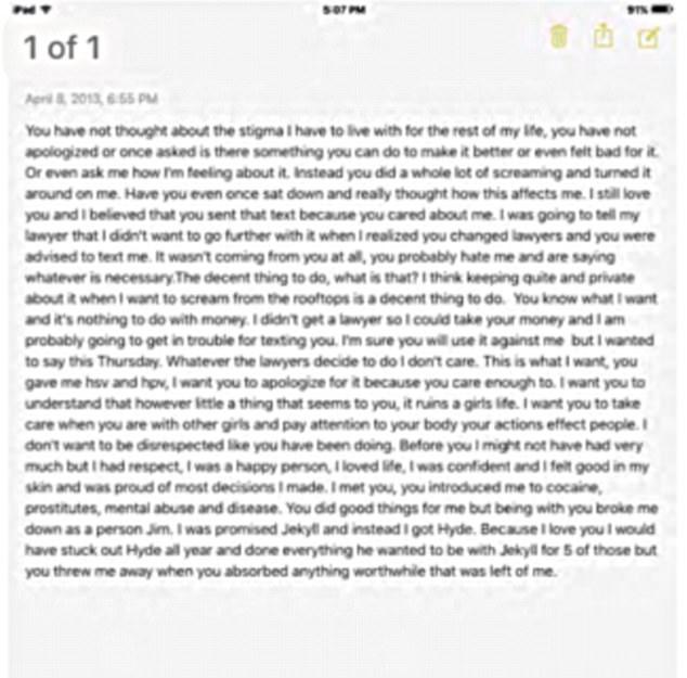 “Esto es lo que me diste: herpes y papiloma, y quiero que te disculpes por ello aunque no te importa”, señaló según la públicación de Daily Mail.