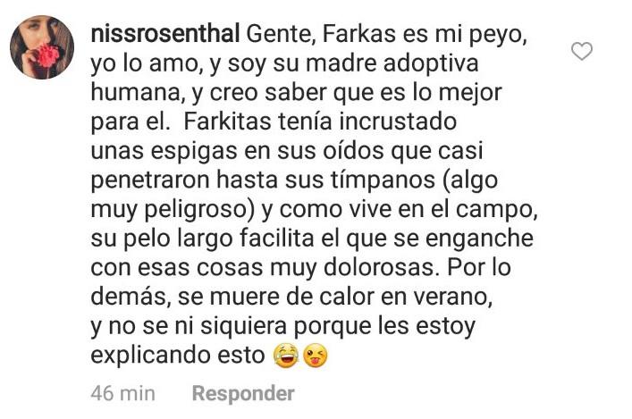 “Gente, Farkas es mi peyo, yo lo amo, y soy su madre adoptiva humana, y creo saber que es lo mejor para él. Farkitas tenía incrustado unas espigas en sus oídos que casi penetraron hasta sus tímpanos (algo muy peligroso) y como vive en el campo, su pelo largo facilita el que se enganche con esas cosas muy dolorosas. Por lo demás, se muere de calor en verano, y no sé ni siquiera porque les estoy explicando esto”, argumentó.