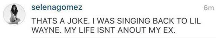 Gómez subió un video a su Instagram -ya borrado, por supuesto- donde cantaba la canción “Single” de Lil´Wayne. Él rapeaba “Ella odia cuando hago esa mierda” a lo que ella responde “¡Lo hacía”, luego sigue “Y cuando llego a casa ella pasa a través de mi mierda” a lo que ella sigue “Sí que lo hacía”, luego, termina gritando “¡Estoy soltera!”.