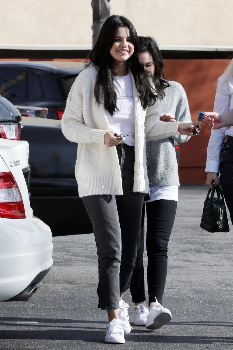 Para la ocasión, Sel eligió un atuendo muy confortable; jeans sueltos, una polera blanca y un chaleco abierto y zapatillas del mismo color.