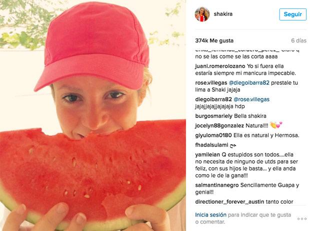 Sin una gota de maquillaje y con una sandía en la mano, Shakira le dio la bienvenida al verano en Instagram. “Los colores del verano”, escribió en la imagen.