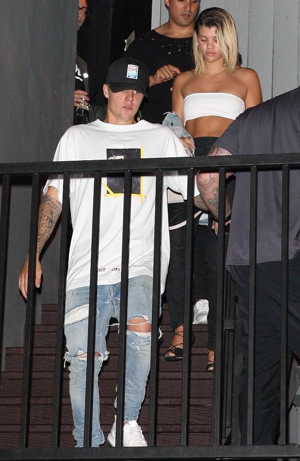 Justin trató de pasar desapercibido con uno de sus clásicos jockeys y una polera blanca, y Sofia lucía espectacular con pantalones negros hasta la cintura, un pequeño crop top blanco y una chaqueta de jeans.