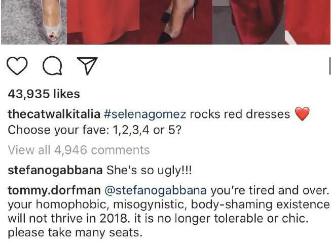 El comentario de Gabbana ya fue borrado, pero por supuesto, están los pantallazos, y miles de fans de Gomez alrededor del mundo se han encargado de hacerle saber al diseñador de 55 años que cometió un gravísimo error al referirse así a la artista.