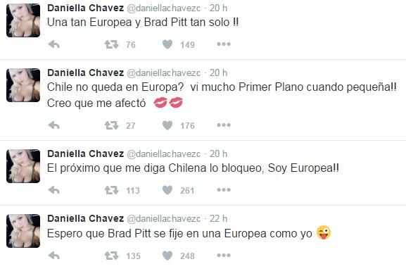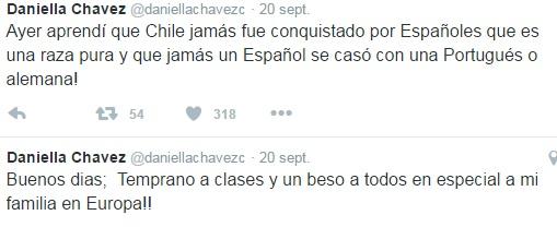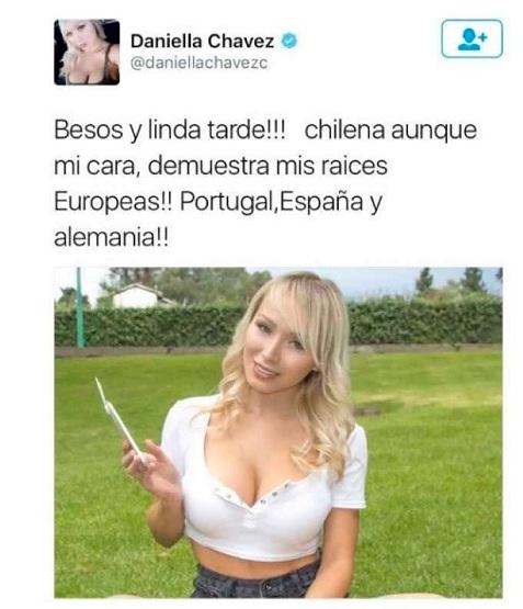 La última controversia se desató en Twitter, donde la modelo de Instagram subió un saludo que dio pie a una serie de críticas. En concreto, Chávez publicó una foto con el siguiente mensaje: “Besos y linda tarde. Chilena aunque mi cara demuestra mis raíces europeas. Portugal, España y Alemania”, escribió.