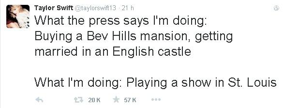 Por eso la intérprete de “Shake It Off” buscó una manera entretenida de responder a los rumores y por medio de su cuenta de Twitter escribió “lo que la prensa dice que estoy haciendo: Comprando una mansión en Beverly Hills, casándome en un castillo inglés. Lo que yo estoy haciendo: Realizando un show en St. Louis”.