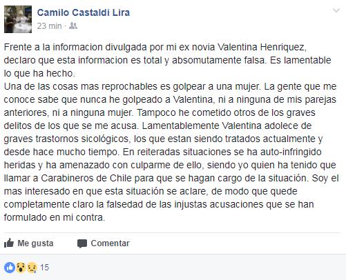 Horas después, es el mismo Castaldi quien sale a defenderse, asegurando que su ex pareja tiene problemas psicológicos, y que incluso se autoinfringe heridas para después culparlo a él. “La gente que me conoce sabe que nunca he golpeado a Valentina, ni a ninguna de mis parejas anteriores, ni a ninguna mujer”, dice el músico en una declaración en Facebook.