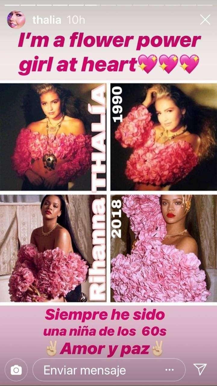 Según E! News Thalía no está fantaseando, puesto que efectivamente este top de flores es el mismo en ambas imágenes. El portal de noticias deja en claro que fue diseñado por Rachel London en el año 1990, especialmente para Thalía y que la producción de Garage lo utilizó para vestir a RiRi.