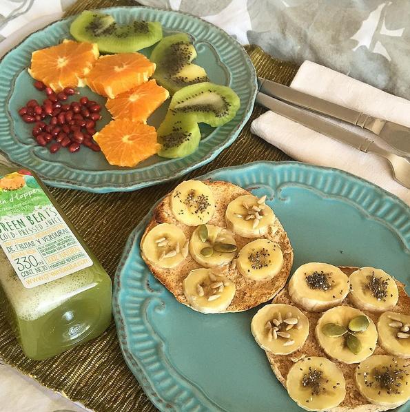 Plato de frutas, pan pita al horno con plátano y semillas: