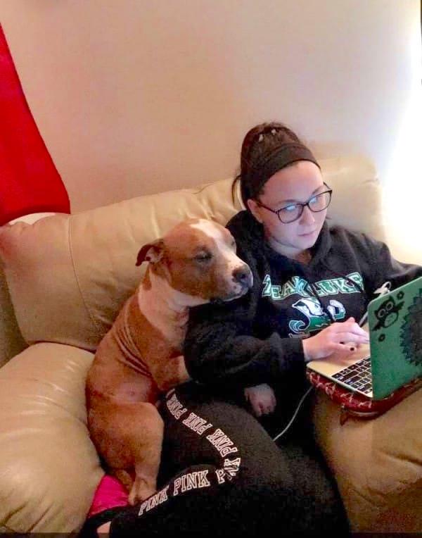 Kayla Filoon, una estudiante de 20 años de la Universidad de Temple en Filadelfia, Estados Unidos. Estaba sentada en el sofá haciendo la tarea, cuando su perro recién adoptado se acurrucó junto a ella. Todo quedó plasmado en una foto que fue tomada por un amigo de la joven, haciéndose viral en internet.