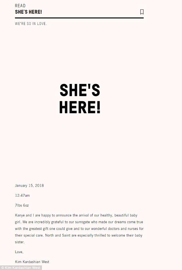 Kim Kardashian anunció que su hija nació el 15 de enero a las 12:47 am vía vientre subrogado (ver nota).