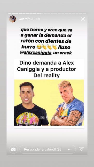 Cabe mencionar que Dino decidió tomar acciones legales contra su ex compañero de encierro en "Resistiré" Alex Caniggia y el productor César Carreño por su expulsión, motivada por un conflicto con Aída Nizar, que es el tema que comentó Valentina en su Instagram.