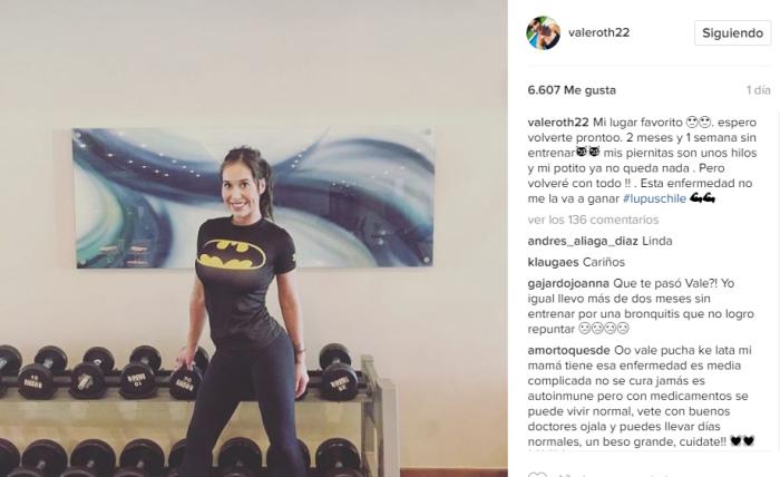 Fue a través de su cuenta en Instagram que Valentina Roth dio a conocer con una foto en el gimnasio, que abandonará su entrenamiento diario por unos meses ¿La razón? La chica fitness padece de Lupus, enfermedad que afecta al sistema inmunitario y que puede causar daños en las articulaciones, piel y algunos órganos. Con un tratamiento constante y ciertos cuidados es posible convivir con esta condición que también padece la celebridad Selena Gomez.