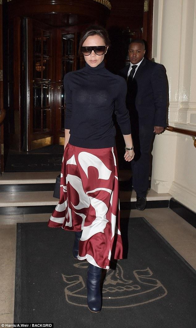 Victoria Beckham sí que sabe llamar la atención de los flashes. La diseñadora salió a la calle de noche con sus icónicos anteojos de sol para que su rostro no sea fotografiado en su totalidad por los reporteros gráficos.