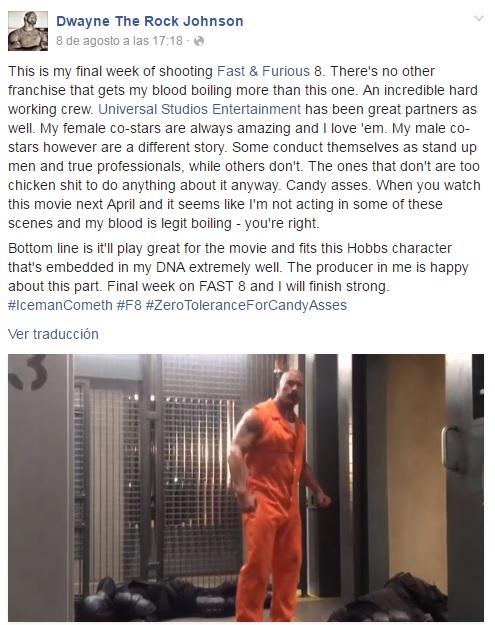 La roca subió un video a Facebook por la última semana de rodaje de la película y agradeció el equipo de la franquicia, pero tuvo duras palabras para los actores, “Sin embargo, mis compañeros de reparto son una historia diferente. Algunos se destacan como hombres y verdaderos profesionales, mientras que otros no. A esos no les importa ya son demasiado flojos para hacer algo al respecto”.
