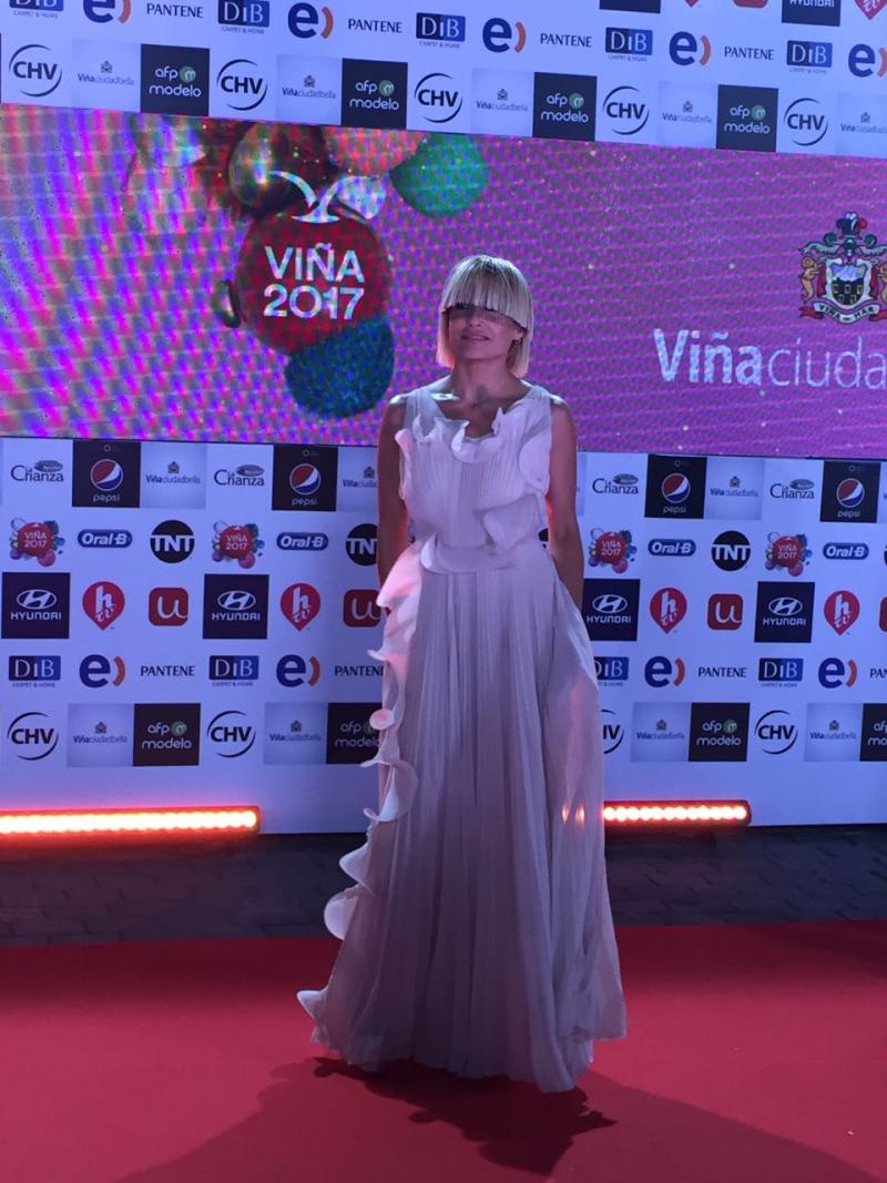 Con un corte con chasquilla, totalmente recto, y un tocado sobre los ojos, Mane se paseó por la alfombra roja de la mano de Marcelo Alonso, recordando los conocidos looks de la cantante Sia, que siempre esconde el rostro en sus apariciones públicas.