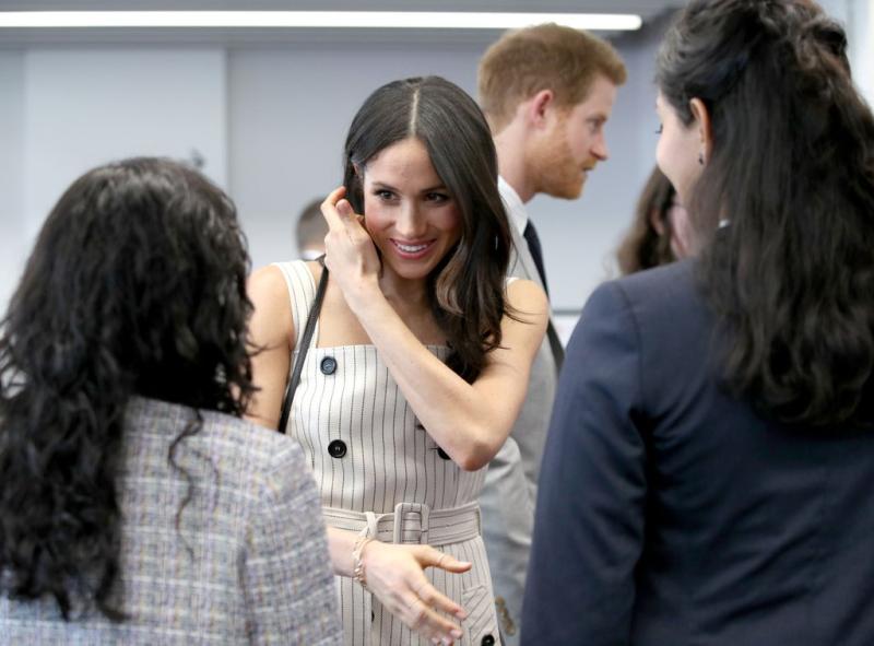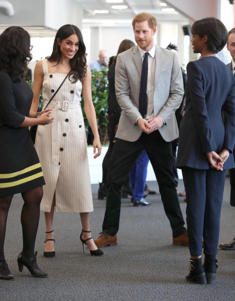 Junto al príncipe Harry la ex actriz se luce con tacones, un vestido de líneas diplomáticas abotonado y con cintura marcada que sin dudas será el diseño de la primvaera que se vive al otro lado del mundo.