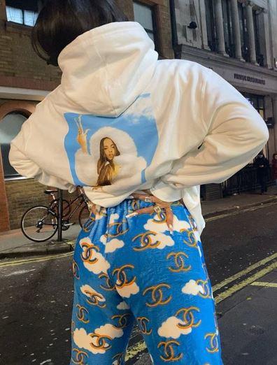 La artista salió con pantalones sueltos Chanel, y un polerón blanco con su cara en la espalda, hecho a medida. La artista etiquetó a Tsuwoop, la marca obsesión de artistas como Billie Eilish y Bad Bunny, que mezcla ropa y arte.