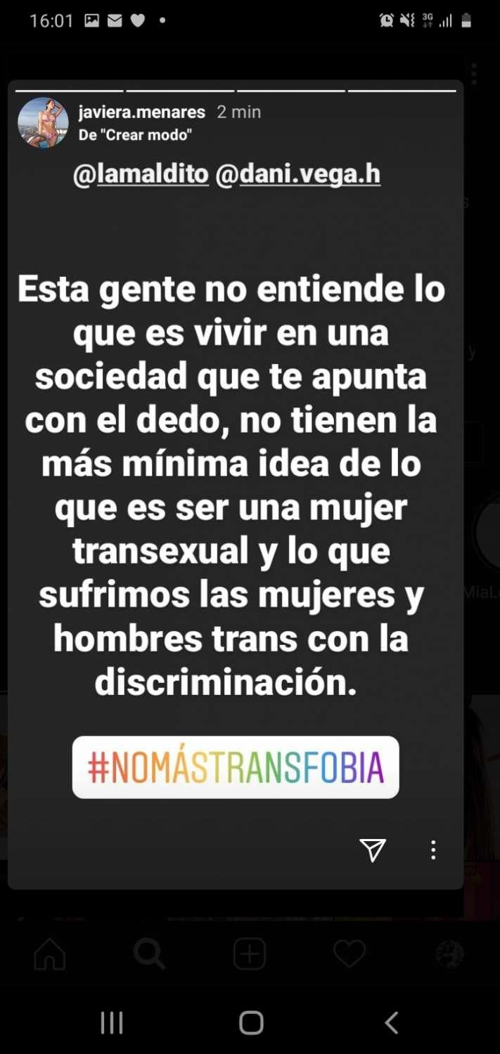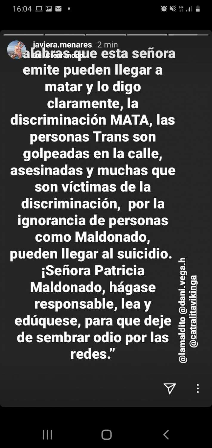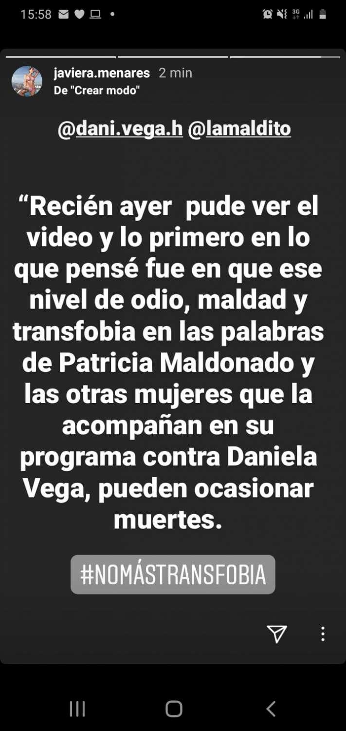 “Recién ayer pude ver el video y lo primero en lo que pensé fue en que ese nivel de odio, maldad y transfobia en las palabras de Patricia Maldonado y las otras mujeres que la acompañan en su programa contra Daniela Vega, pueden ocasionar muertes. Esta gente no entiende lo que es vivir en una sociedad que te apunta con el dedo, no tienen la más mínima idea de lo que es ser una mujer transexual y lo que sufrimos las mujeres y hombres trans con la discriminación", expresó en historias de Instagram.