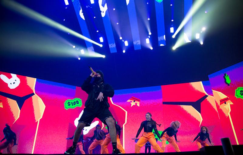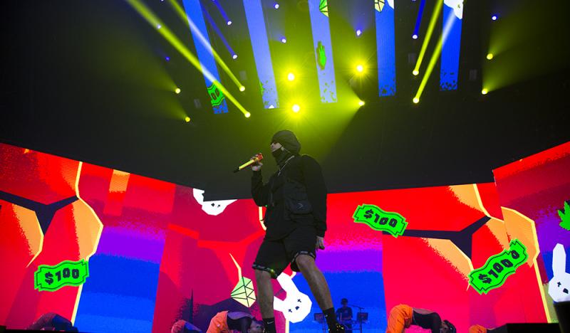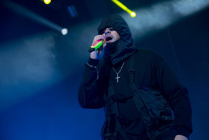 Ya en su tercer tema "¿Quién tú eres?" dejó al descubierto su cara siendo ovacionado por la multitud. Entre sus hits interpretados destacaron un medley de antiguas canciones como "Diles", "Tú no vives así ", "Krippy Kush" y "Soy Peor".