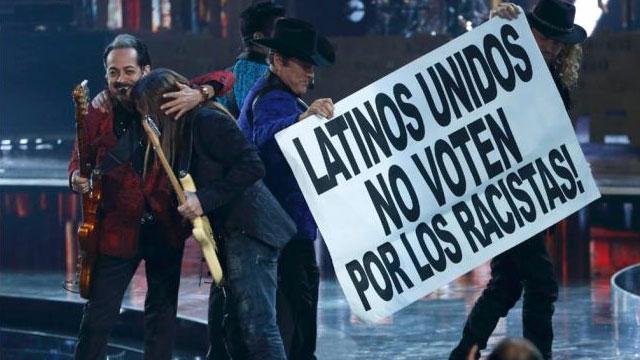 Luego de interpretar el tema “Somos más americanos”, los artistas mostraron un lienzo donde se podía leer: “Latinos unidos no voten por los racistas.