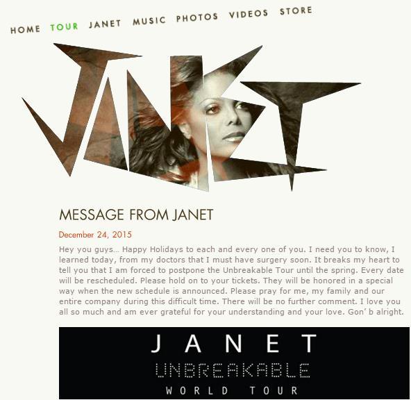 Janet Jackson, la más pequeña de la familia Jackson, escribió en su página web y redes sociales que tendrá que posponer su gira por una operación que se hará pronto y que de hecho, tendrá que posponer su gira “Unbreakable” hasta primavera.