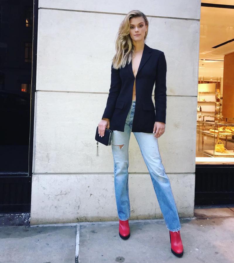 En esta misma línea Nina Agdal se atreve y lo lleva con unos jeans y nada debajo. Tal cual.