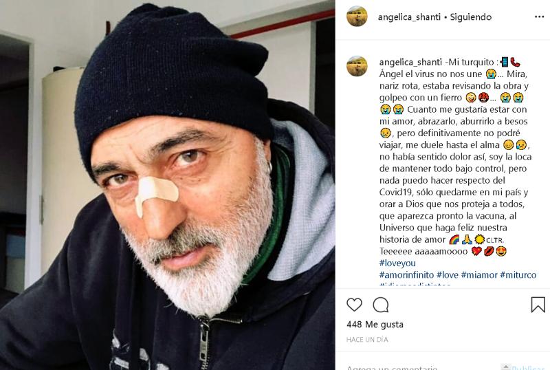 “Mi turquito: Ángel el virus no nos une... Mira, nariz rota, estaba revisando la obra y se golpeó con un fierro. Cuanto me gustaría estar con mi amor, abrazarlo, aburrirlo a besos, pero definitivamente no podré viajar, me duele hasta el alma, no había sentido dolor así, soy la loca de mantener todo bajo control, pero nada puedo hacer respecto del Covid19, sólo quedarme en mi país y orar a Dios que nos proteja a todos, que aparezca pronto la vacuna, al Universo que haga feliz nuestra historia de amor”, escribió junto a una foto del turco tras su accidente.