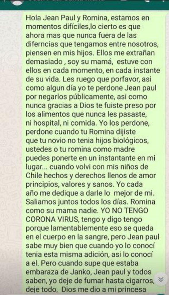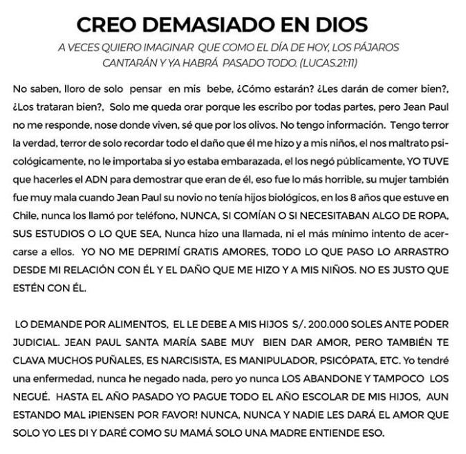 Angie Jibaja reapareció en redes sociales con un desesperado llamado. Una carta aloja en su cuenta de Instagram y en ella la modelo asegura que "ya no puede más". Angie evidenció los mensajes de WhatsApp que le envía al padre de sus hijos, Jean Paul Santa María, quien tiene la custodia de los dos niños.
