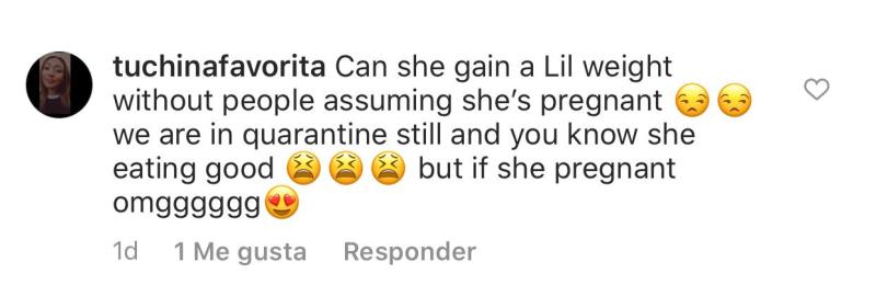Pero como hubo comentarios negativos, también vale destacar el apoyo que recibió. “Ella puede subir un poco de peso e inmediatamente todos asumen que está embarazada. Estamos en cuarentena aún y sabemos que se alimenta bien… de todas formas si está embarazada ‘omg’”, escribió la usuaria identificada como @tuchinafavorita.