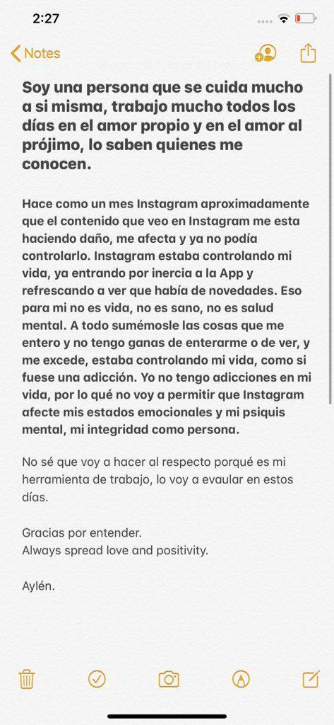 “No sé qué voy a hacer al respecto porque es mi herramienta de trabajado, lo voy a evaluar en estos días. Gracias por entender. Always spread love and positivity. Aylén”, señaló por último.