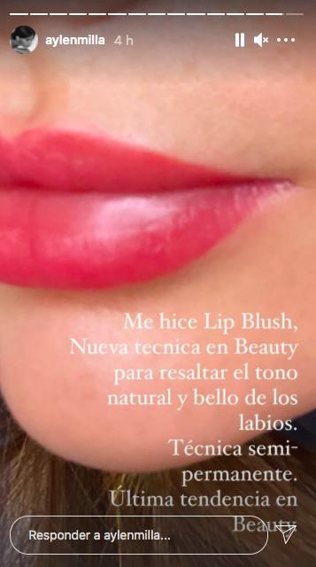 "Me tapo la boca porque está infladísima, infladísima. Hasta que no baje no la voy a mostrar", expresó para luego con el correr del tiempo dar a conocer una foto del resultado. De acuerdo a su explicación, la técnica que desarrolló en sus labios se llama "Lip Blush", un tinte permanente que mantiene enrojecida la zona, tal como un efecto de labial permanente.