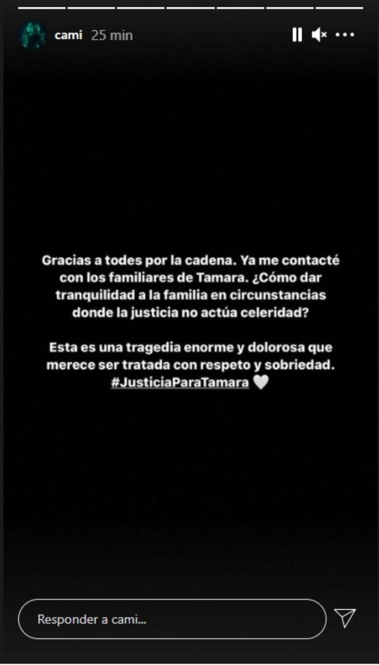 "Querida Cami, mi hija Tamara era fanática de tus canciones, cantábamos en el auto cada vez que salíamos. Tu música le llegaba desde muy chiquitita. Desearía tenerte presente el día de su funeral, que pudieras cantarle y que ella desde el cielo pueda cantar contigo. A todos mis amigos y conocidos les pido le hagan llegar este mensaje", se puede leer en la publicación hecha a través de Instagram.